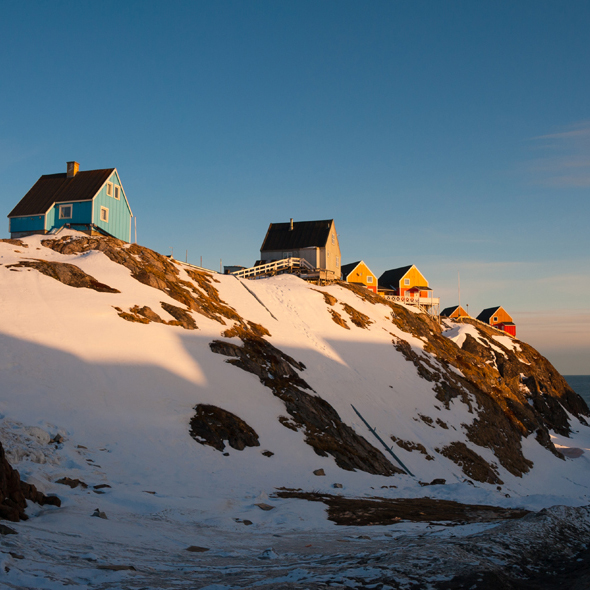 Beautifully situated in the the Disko Bay close to the gigantic icebergs from the world's most productive glacier we find in Ilulissat, North Greenland's largest town. Ilulissat is where ancient and modern Greenland meet in the most harmonic way. 5000 sledge dogs, and two modern fish factories provide employment for the population. A landing strip runs alongside the old sledge track to Thule. Whether you visit Ilulissat in March when the temperature is minus 30° C below zero (22°F) or in July when it might rise to 17°C (63°F)in the shade you will find an abundance af activities to enjoy - perhaps a sledge trip to one of our nearby villages? Or a boat trip in the unique light of the midnight sun. Greenland tends to enter the soul, and many of our guests come back year after year. Up here the sky is high and the scenery varies from quiet evenings at the edge of a lake to the thunder of "calving" icebergs.