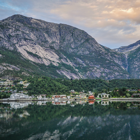 A fruit growing center, Hellesylt sits at the head of Sunnyvenfjord, where a mighty watefall cascades into the sound from massive granite cliffs. Nearby are colorful fruit orchards, Europes deepest lake and mountain scenery of timeless beauty.