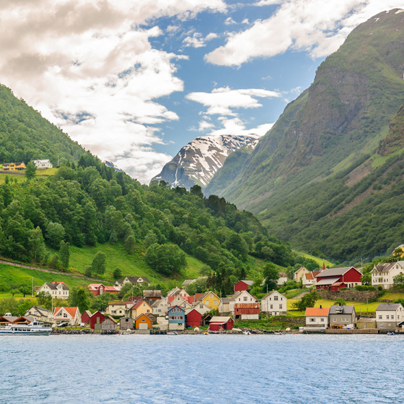 The charming village of Gudvangen lies at the end of the magnificent Naerofjord. Nearby, the Kilefoss Waterfall cascades into a superfine mist as it tumbles from a cliff face mearly 2,000 feet above the valley floor.