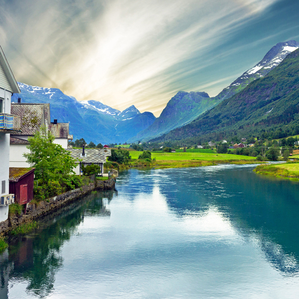 Situated along the innermost arm of the Nordfjord, this picturesque village of western Norway is surrounded by some of Scandinavia´s most captivating scenery. Here lies the largest glacier in all of Europe, the Jostedal, towering nearly 6,200 feet over a deep valley. The green fields, serene lakes and cascading falls of this region are simply breathtaking.