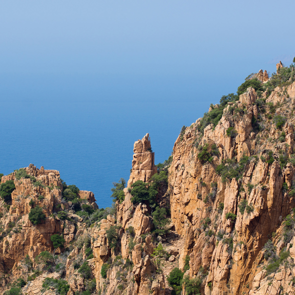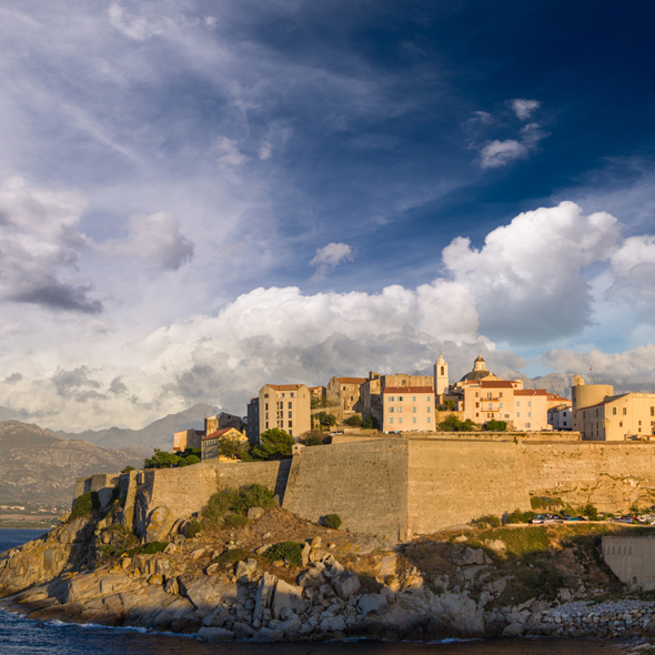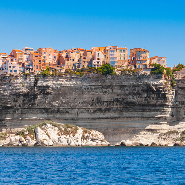 With its spectacular cliff-top setting, this ancient Corsican fortress-town has withstood many sieges. The 15th century steps, cut high in the rock face, are evidence of its troubled history. Today, medieval buildings crown the slopes leading to the fortress which overlooks the beautiful, multi-colored sea below.