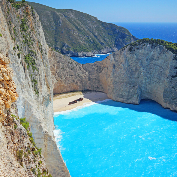 Zakinthos, also called Zante, is one of the largest Ionian Islands located off the Western coast of Greece. Like its more well-known neighbor to the North, Corfu, the island is blessed with lush vegetation and delicate beauty. The whitewashed town greets visitors with shops and cafes, while unspoiled beaches on the Western shore tempt sun worshippers and sea bathers.
