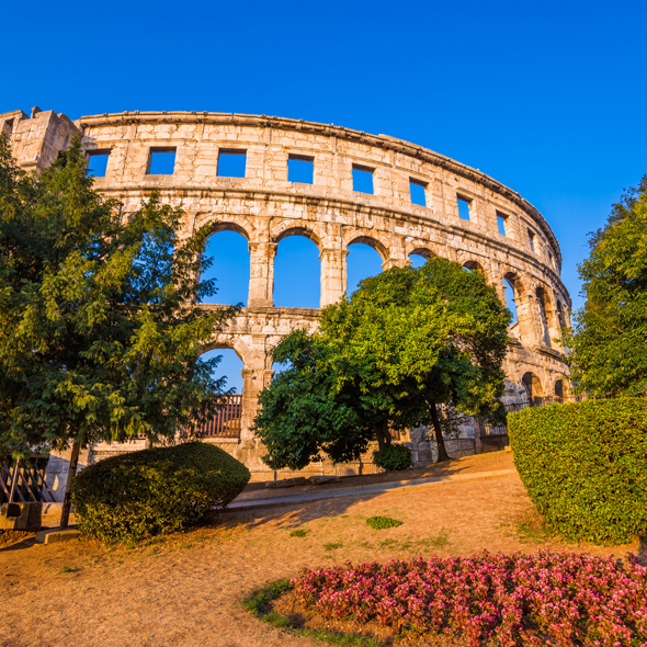 On the southern part of the Istrian peninsula, at the end of the Gulf of Pula, a town of antiquity, of parks, and of summer festivals dominates. Pula, the largest city and port in Istria, a communication economic and administrative center, is an attractive place to spend a holiday for many tourists, with some 2,350 hours of sunshine a year. The history of the town is etched in every stone, which is indicated by the large number of cultural historic monuments from almost all periods of its past, of which many are an integral part of the fabric of the city.