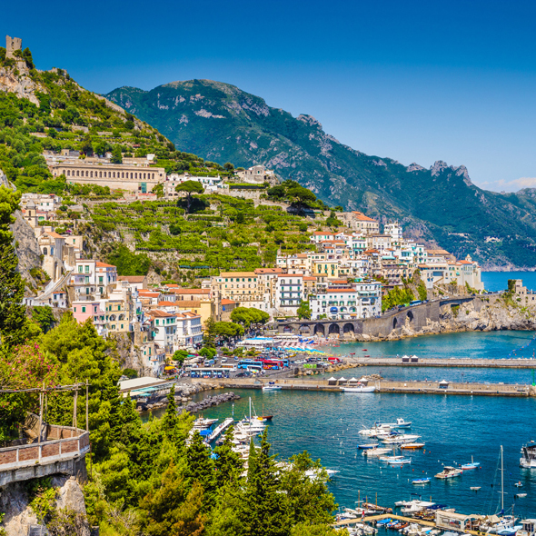 Located roughly between Salerno and Sorrento, Amalfi was already an important maritime republic in the Middle Ages. In fact, the Amalfi Tables represent the oldest maritime code in the world, which were observed throughout the Mediterranean until the late 16th century. Today, Amalfi is one of the most popular resorts and stopovers along the famed Amalfi Drive, Italy's celebrated corniche that hugs the mountainous coast and carves its way through sheer rock. Opulent villas, cloaked in brilliantly colored bougainvillea, hide behind high walls and wrought-iron gates. Waves pound against the steep shoreline and tortuous bends challenge a steady stream of tourist vehicles. Around every hairpin turn spectacular scenery awaits. Spread across the slope of the steep Lattari hills, the town itself boasts a superb setting and plenty of charm. The small, inviting center features several attractions that should not be missed. Of particular note is the duomo, also known as Cathedral Sant'Andrea, a marvel of ancient Arab-Moorish architecture. The church dominates the lively piazza, full of shops and crowded with residents and tourists at any time of day. Ruggedly beautiful and enchanting Amalfi will guarantee you a delightful introduction to Italy’s famed coastline.